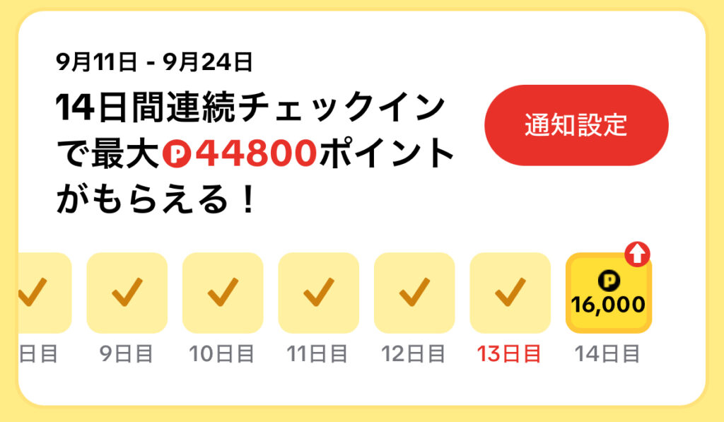 毎日ログインするだけでポイントが貯まるので習慣化がおすすめ。今なら14日連続チェックインで最大448円相当のポイントがもらえます。