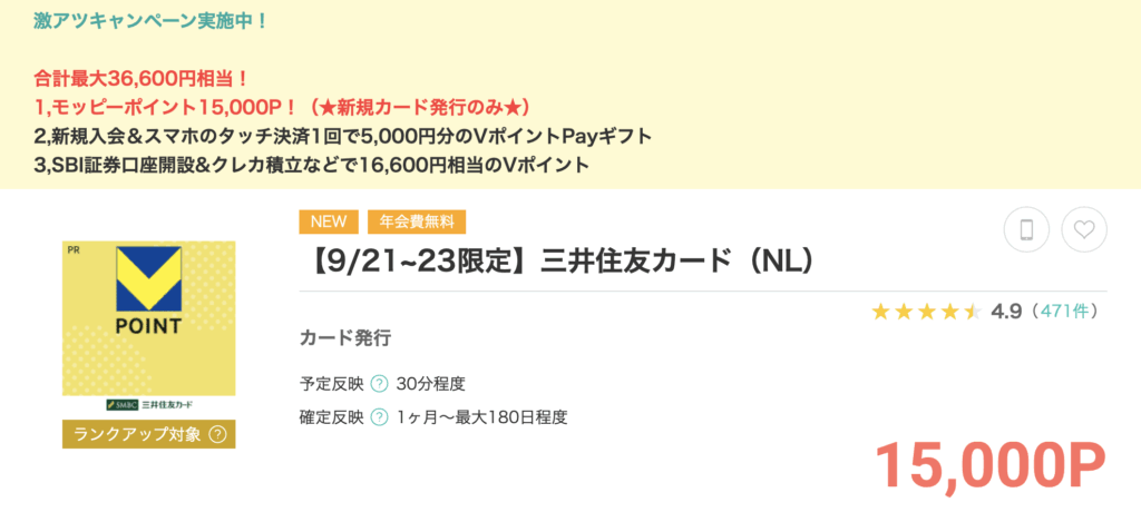 さらに、クレジットカードの入会特典ももらえる可能性があるので、モッピーと合わせて20,000円相当の還元も狙えちゃいます。
