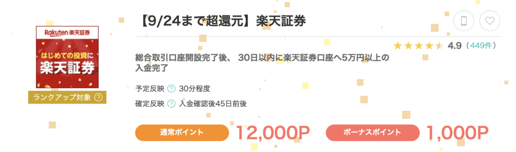 口座開設し、口座への入金等の条件をクリアすると5,000〜10,0001ポイント以上の高還元が狙えます。